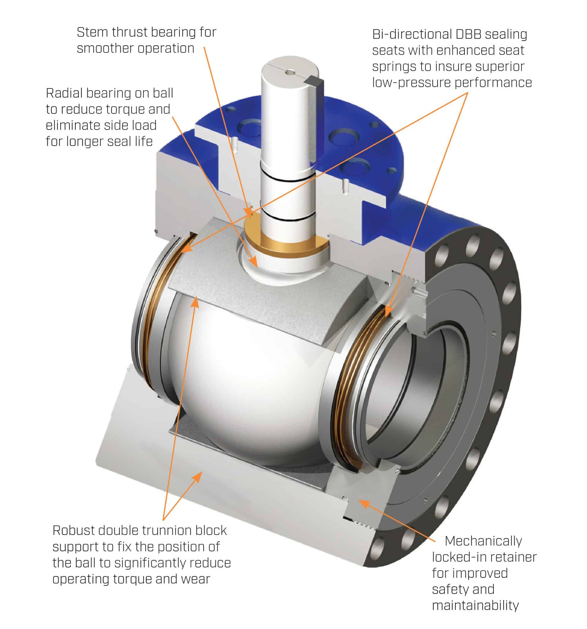 The CORTEC Model “D” Series Ball Valve is a double trunnion design. The ball is held firmly in place by two large trunnion blocks, allowing only rotational movement. With the ball always perfectly aligned, independent spring-loaded upstream and downstream seats are always in contact with the ball, which provides an effective tight seal even at very low pressures.